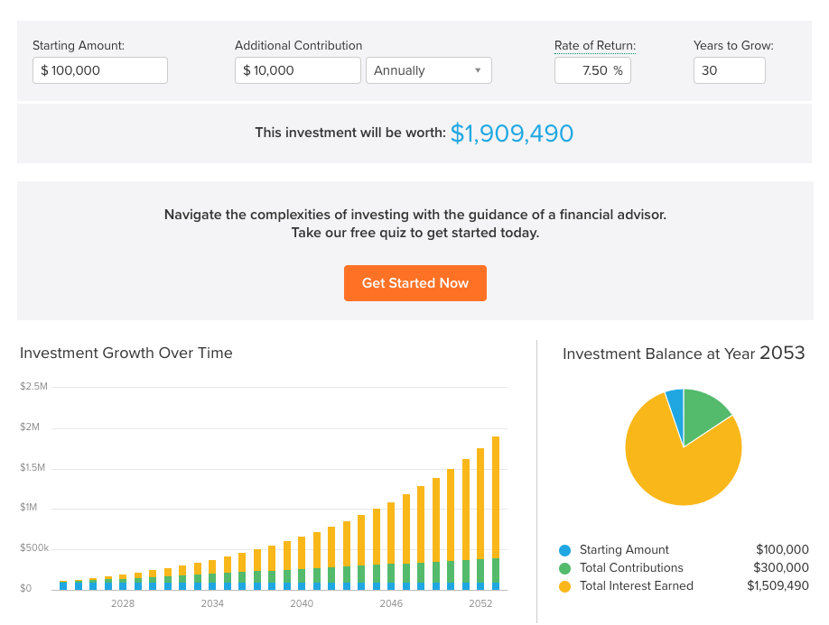 Well let’s do a simple projection. If we adjust for inflation - the S&P 500 has returned on average 7.44% over the last 100 years including dividends. If we round this to 7.5% and then calculate the return with a starting amount of $100K with $10K invested every year for 30 years at a 7.5% compounding rate → we get $1.909 million dollars.